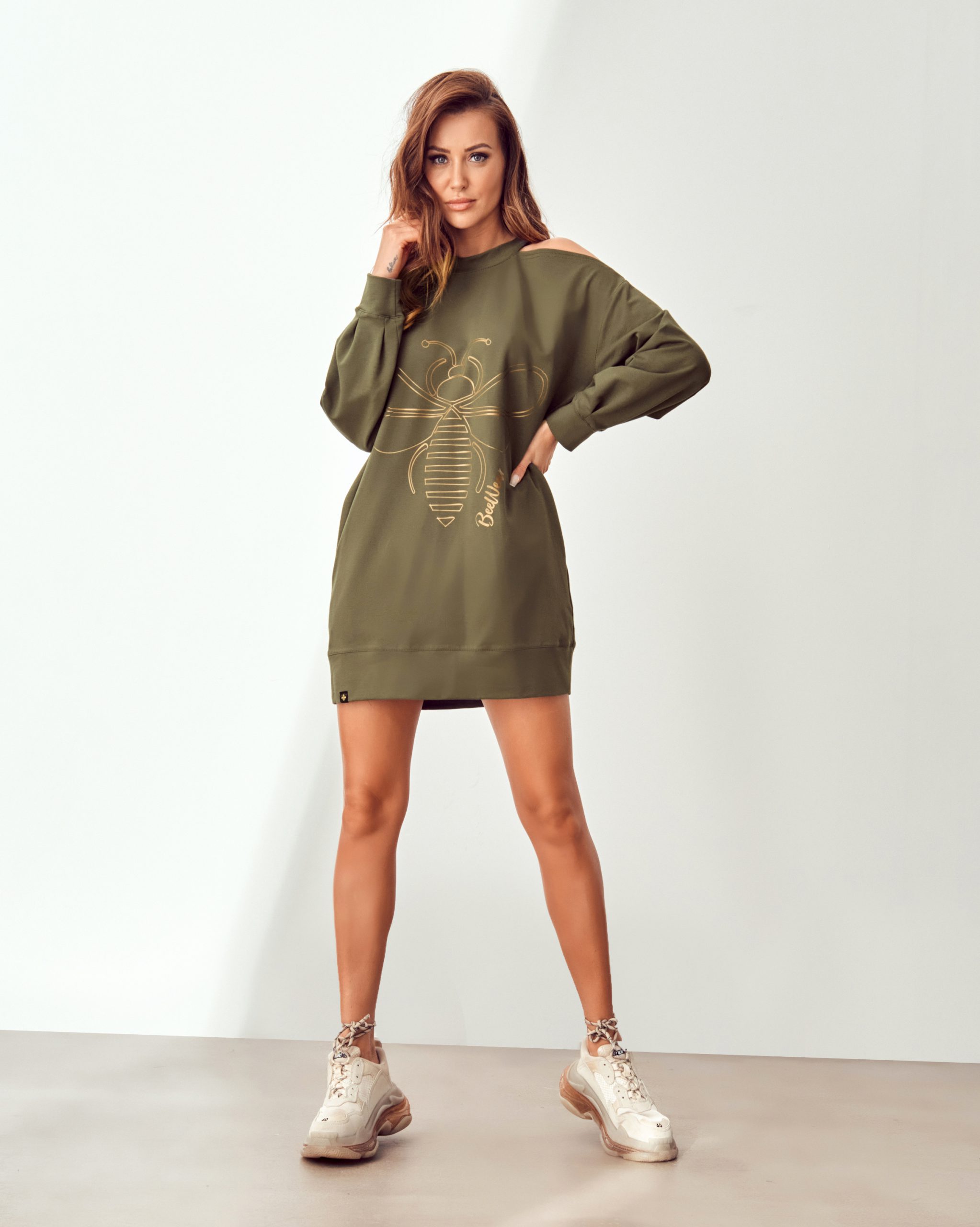 Wygodna, bawełniana tunika z fantazyjnym wycięciem na lewym ramieniu i złotą pszczółką.