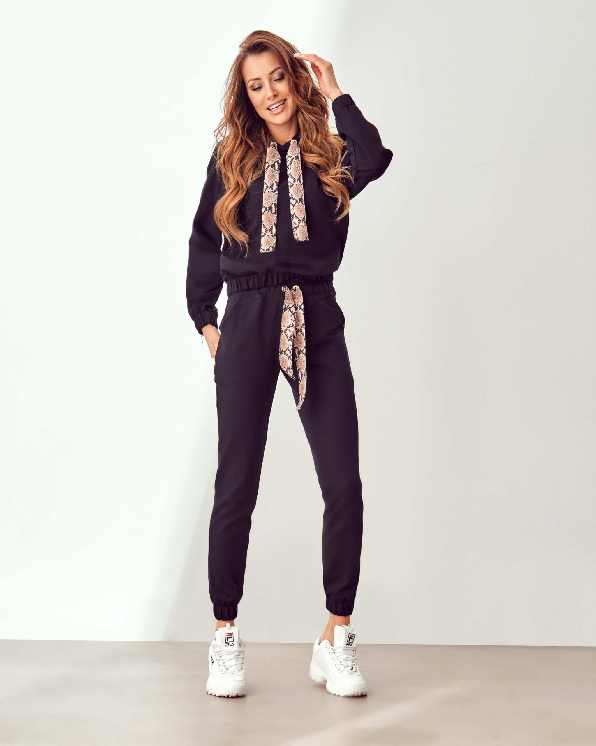 Komplet dresowy wykonany z dzianiny bawełnianej. Bluza z kapturem wykończona dekoracyjną taśmą nada charakter Twojej stylizacji! Spodnie z gumką w pasie wykończone dekoracyjną taśmą. Idealna propozycja na weekendowy wypoczynek