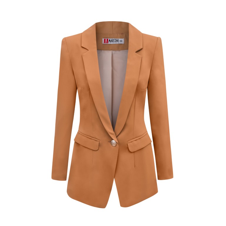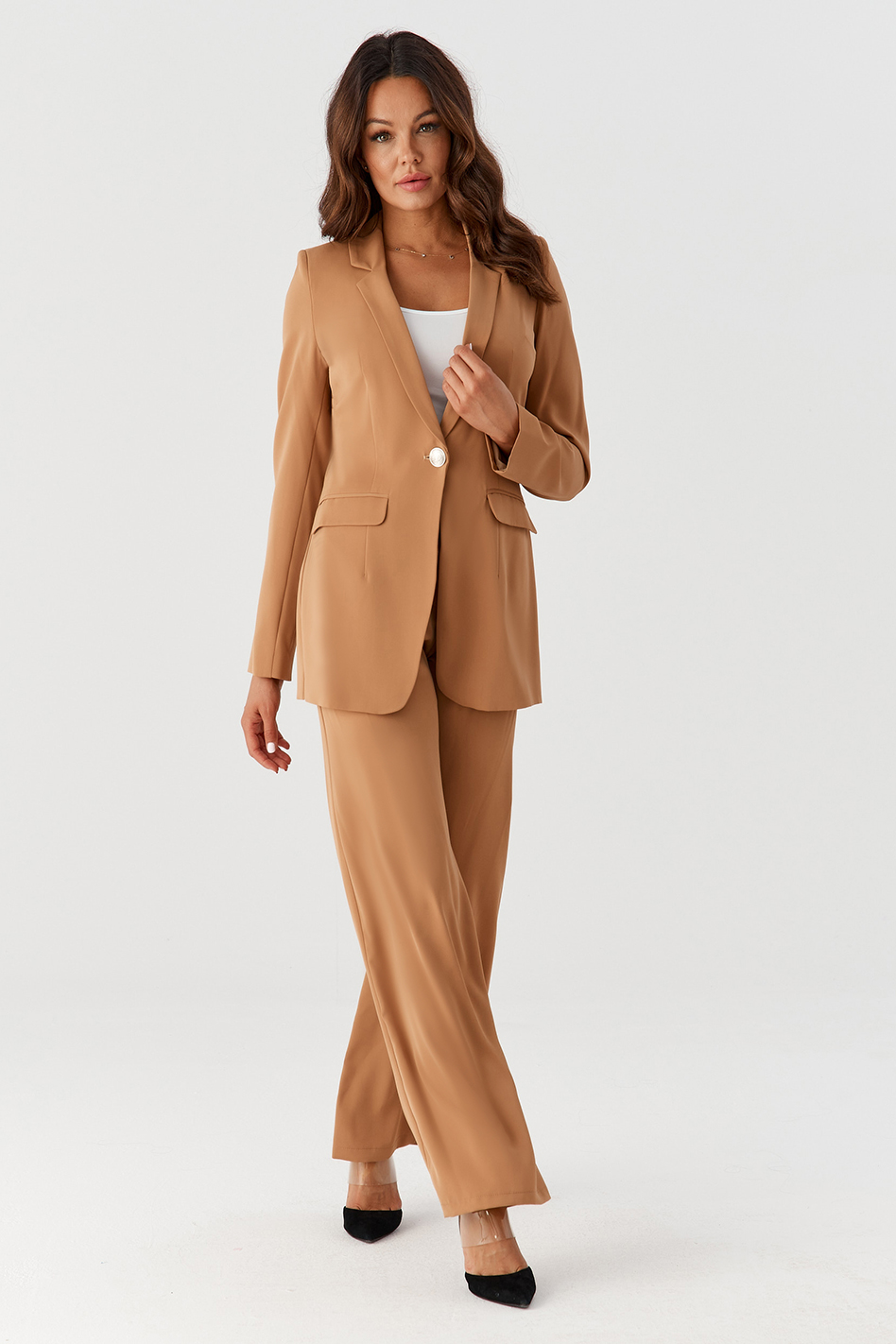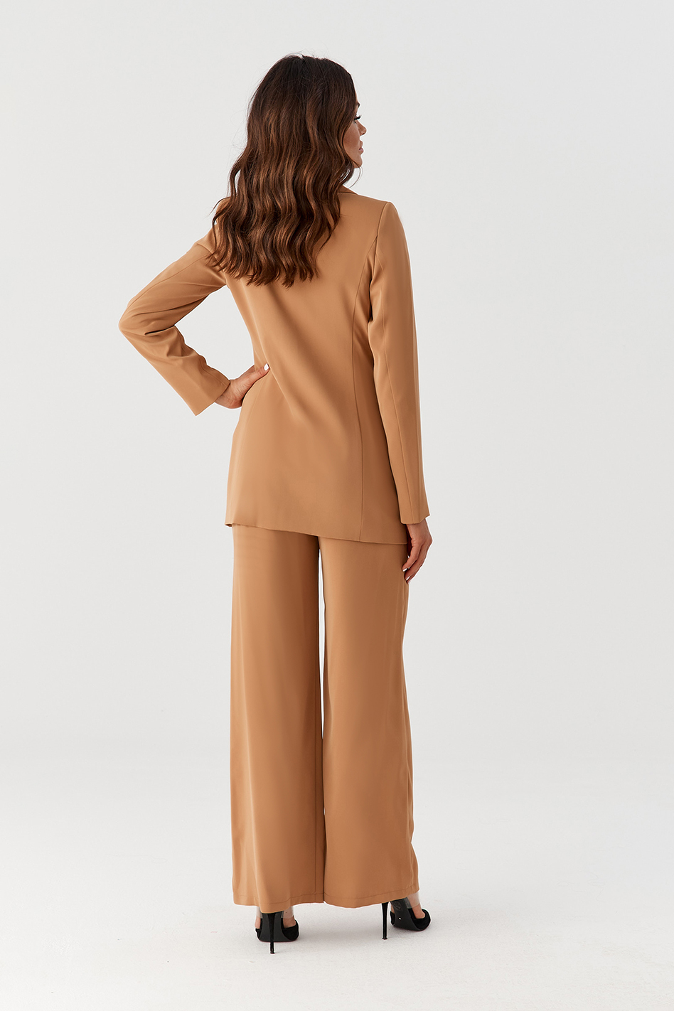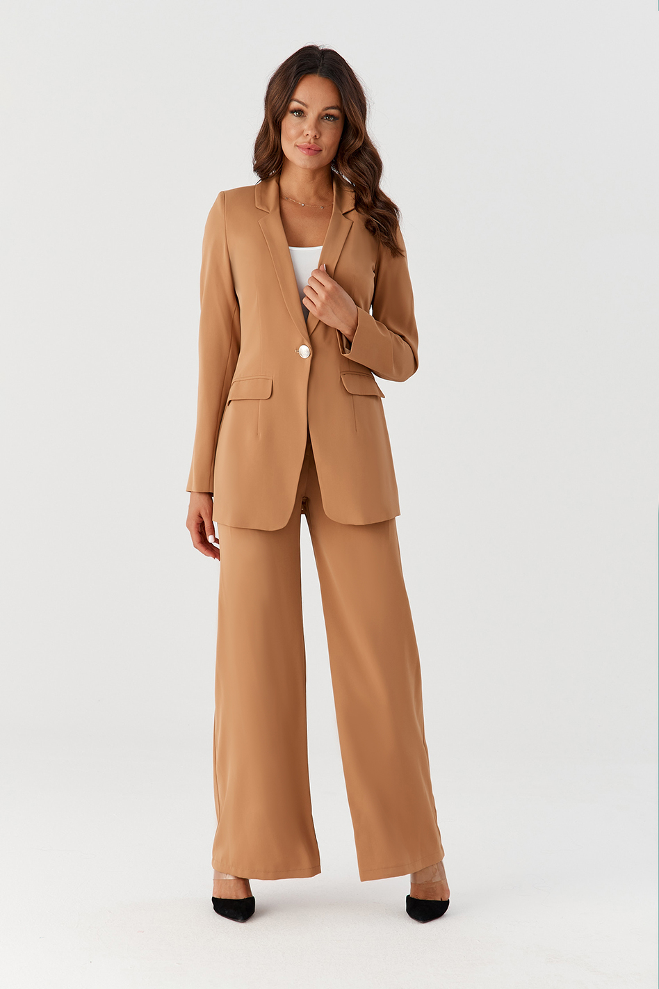 Garnitur damski -zestaw żakietu i spodni, który warto mieć w swojej szafie. Żakiet o bardzo ciekawym, wydłużonym kroju wspaniale wysmukla sylwetkę. Idealnie komponuje się ze spodniami o szalenie modnych, szerokich nogawkach.