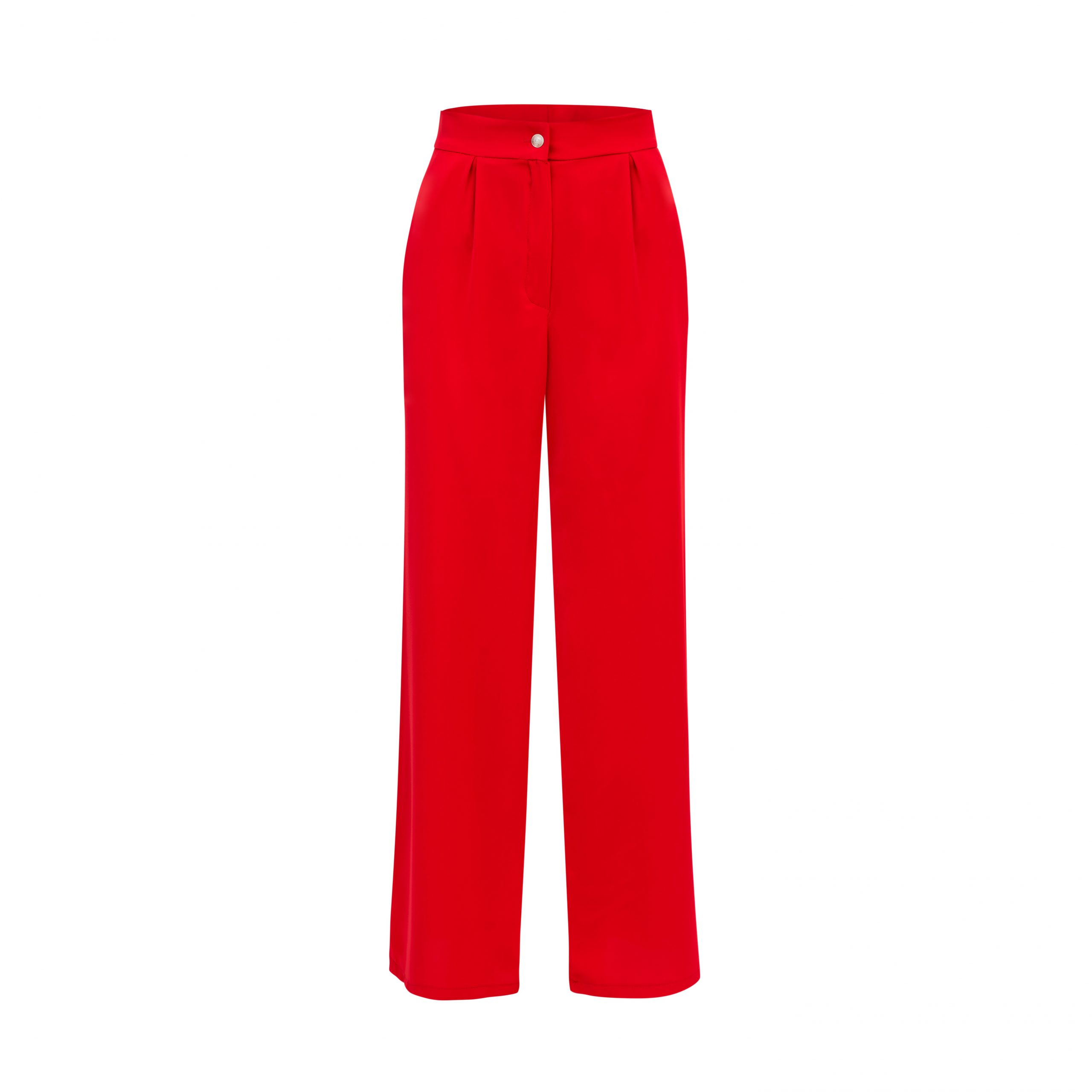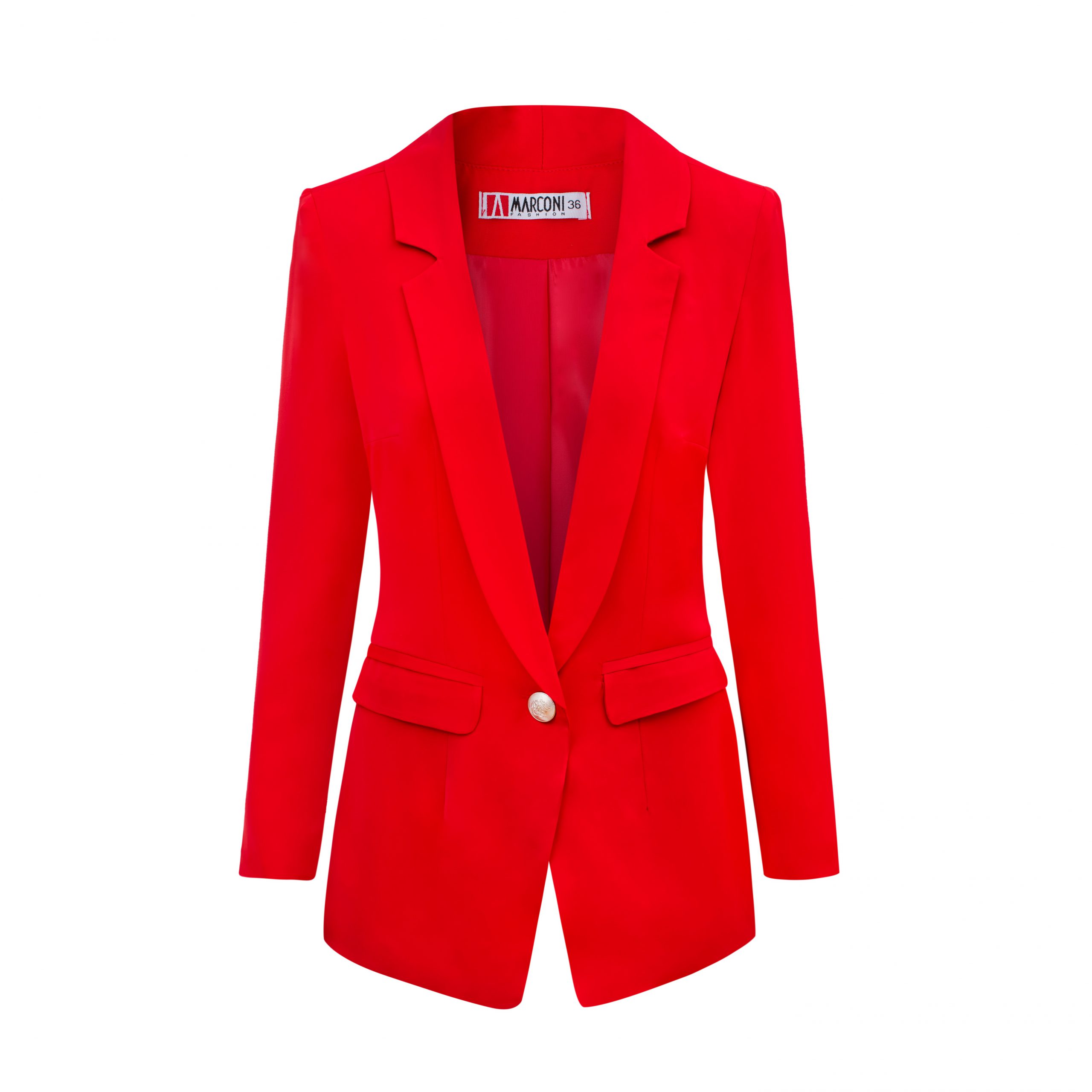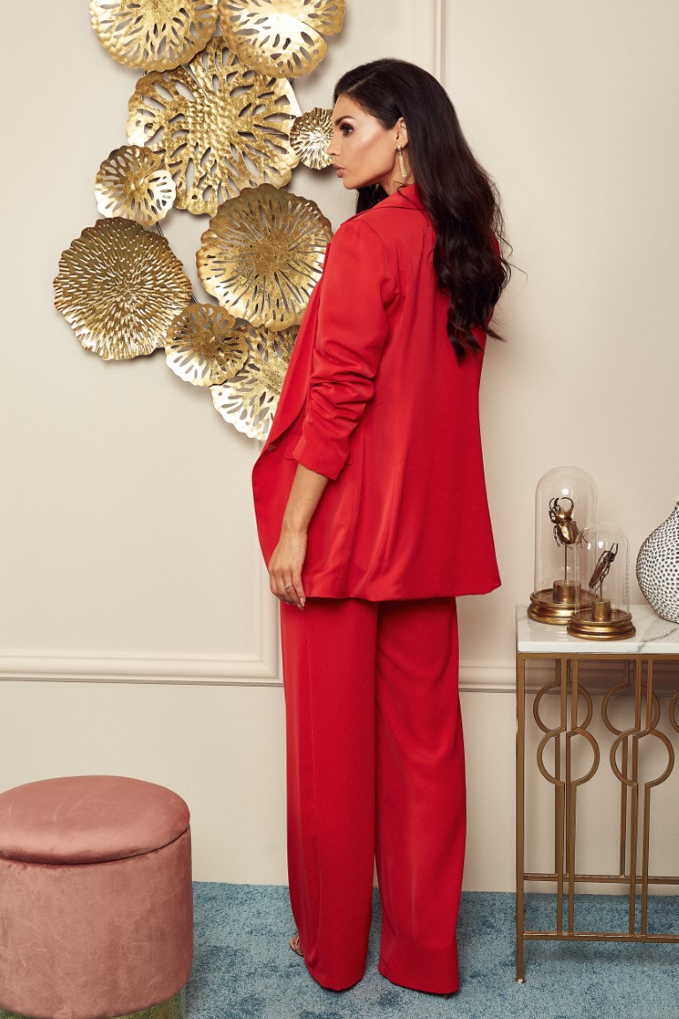 Garnitur damski -zestaw żakietu i spodni, który warto mieć w swojej szafie. Żakiet o bardzo ciekawym, wydłużonym kroju wspaniale wysmukla sylwetkę. Idealnie komponuje się ze spodniami o szalenie modnych, szerokich nogawkach.