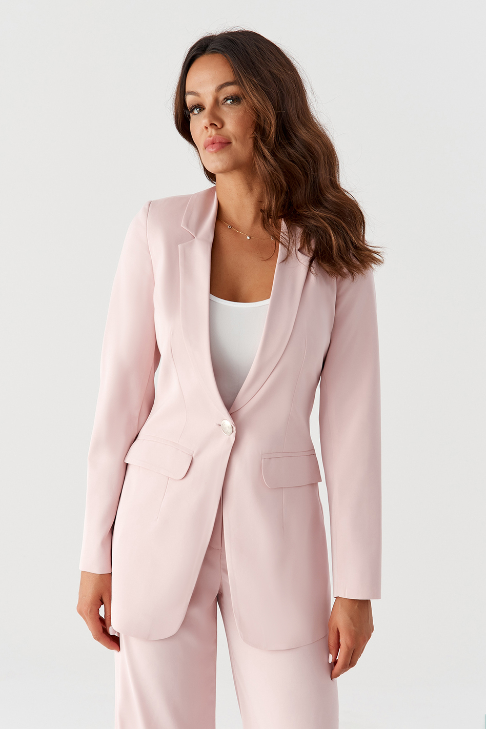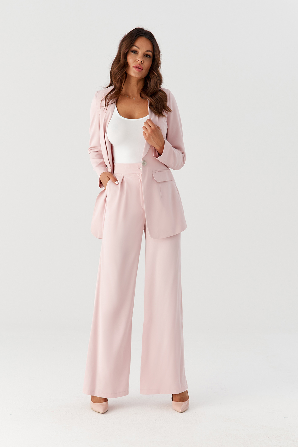 • Skład zestawu: dłuższa marynarka i spodnie z szeroką prostą nogawką