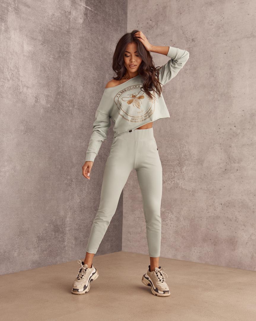 Krótka bluza ze złotą aplikacją, doda niepowtarzalnego charakteru  Twojej stylizacji! A wraz ze spodniami z wyższym stanem stworzy świetny zestaw. Cały dres uszyty jest z dzianiny bawełnianej.