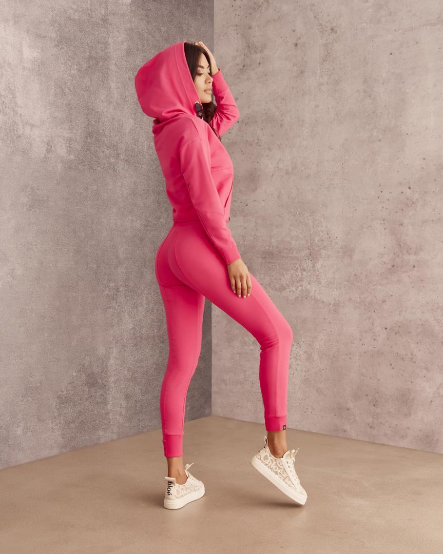 Na cały komplet dresowy składa się:  bluza kangurka z kapturem i dwiema kieszeniami oraz spodnie dresowe, z wyższym stanem.