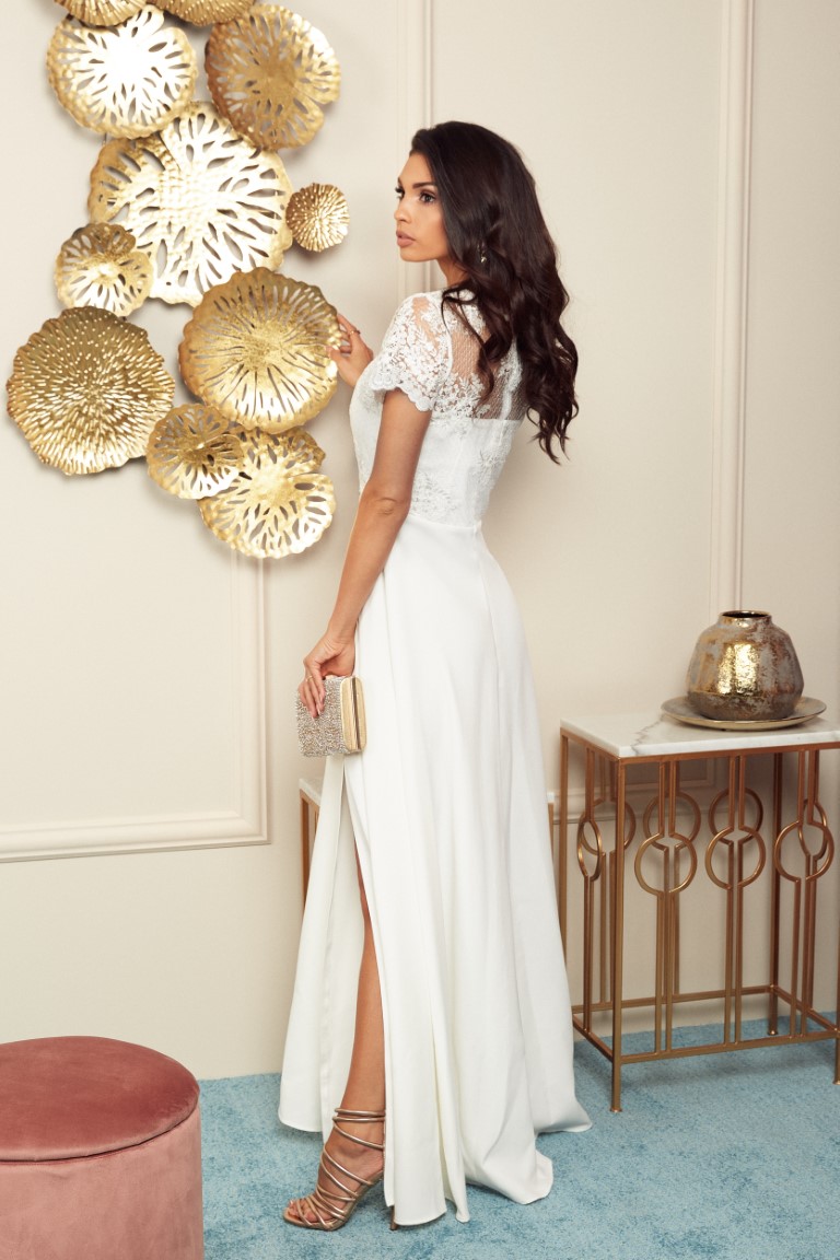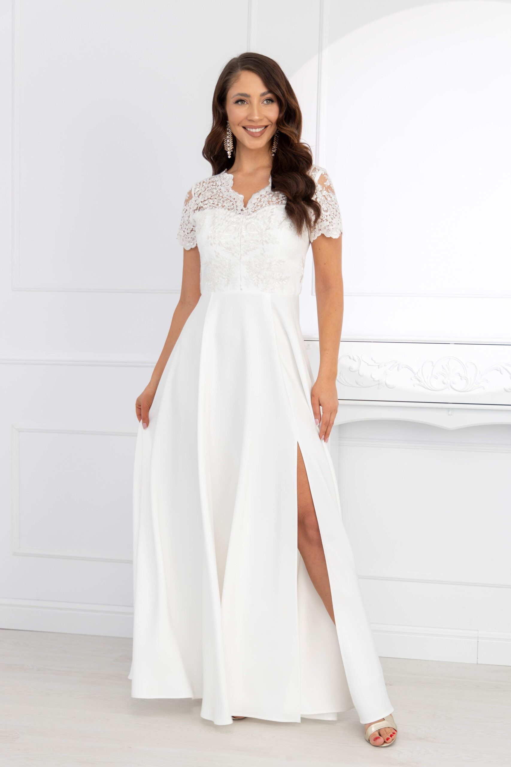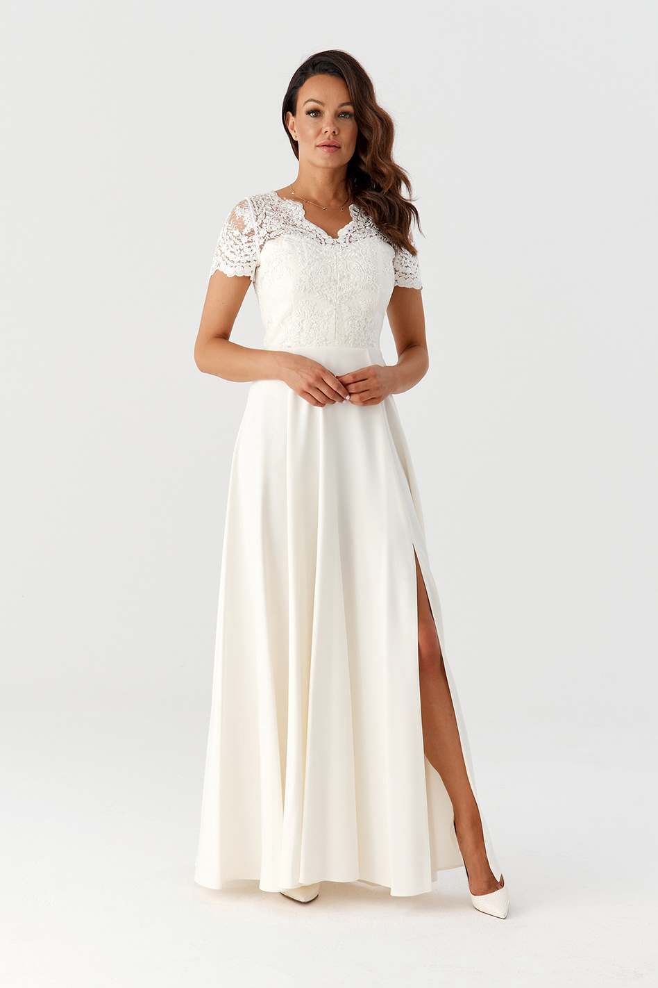 Zestawienie ponadczasowej koronki z delikatną tkaniną to niezapomniany look dla każdej przyszłej panny młodej. Dopasowana góra, i luźno puszczone biodra tworzą bardzo atrakcyjną całość. Zmysłowe rozcięcie na nodze nadaje jej  lekkości i zwiewności, zapewniając przy tym niezwykłą swobodę noszenia.