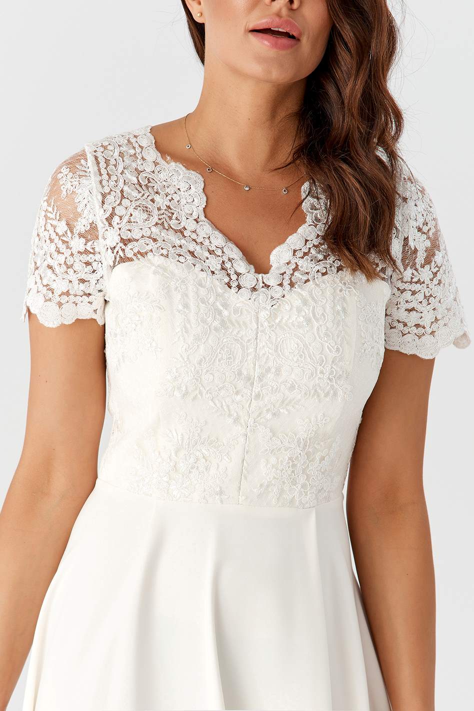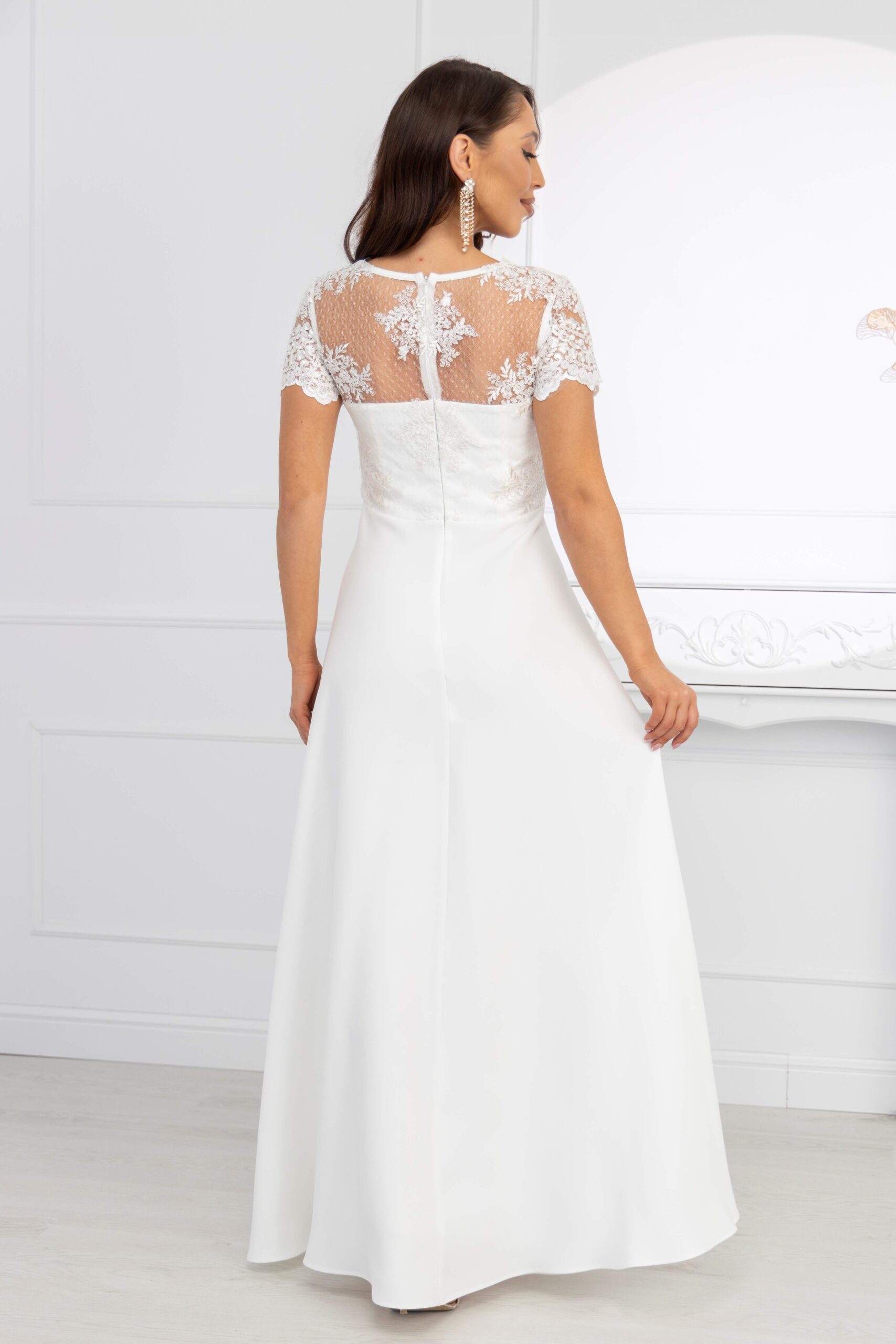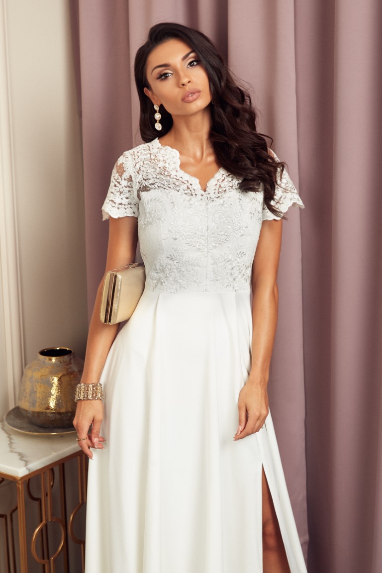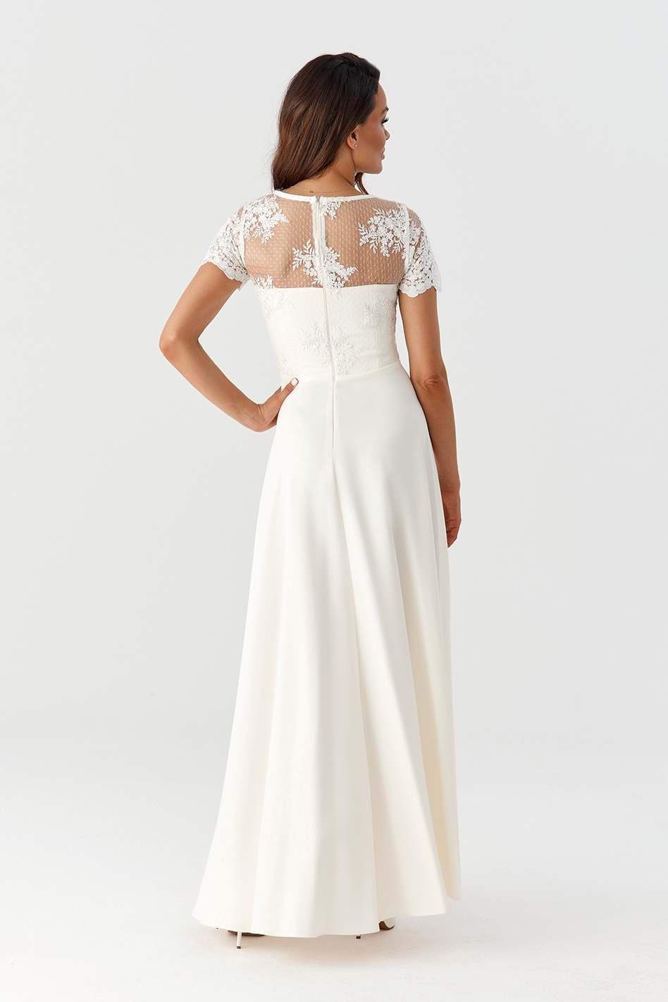 Zestawienie ponadczasowej koronki z delikatną tkaniną to niezapomniany look dla każdej przyszłej panny młodej. Dopasowana góra, i luźno puszczone biodra tworzą bardzo atrakcyjną całość. Zmysłowe rozcięcie na nodze nadaje jej  lekkości i zwiewności, zapewniając przy tym niezwykłą swobodę noszenia.