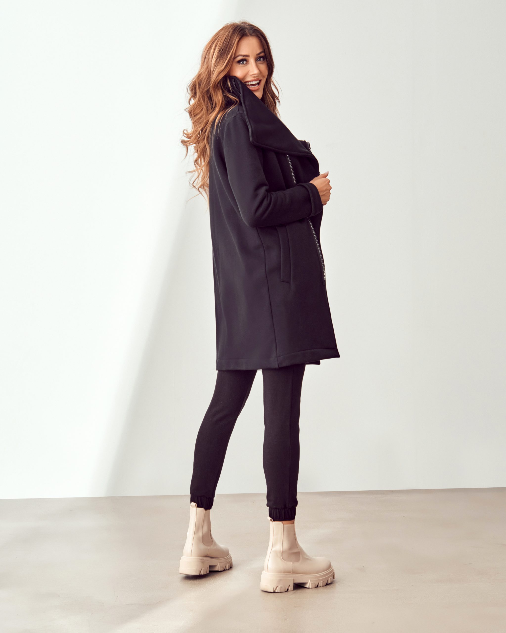 Ekspres wszyty po skosie nadaje oryginalności. Płaszcz posiada ciekawy krój kołnierza, który można nosić na dwa sposoby.