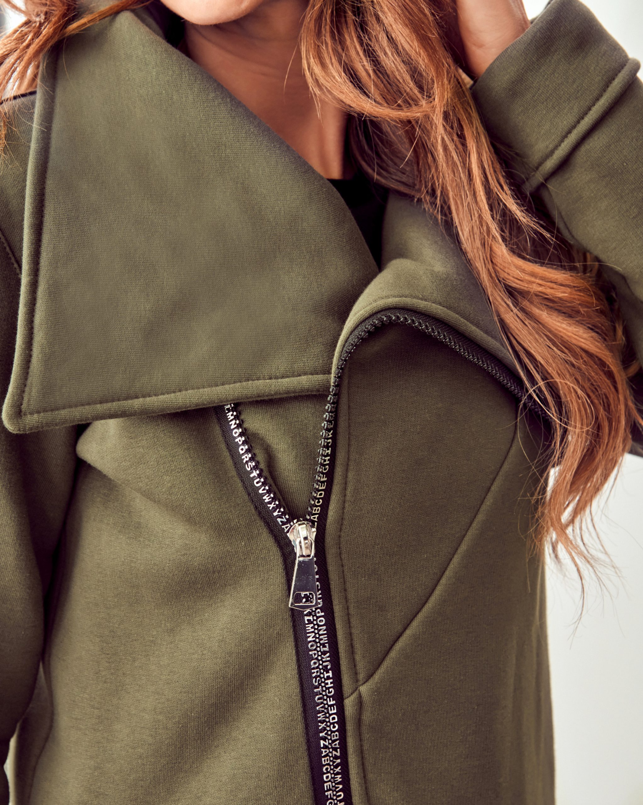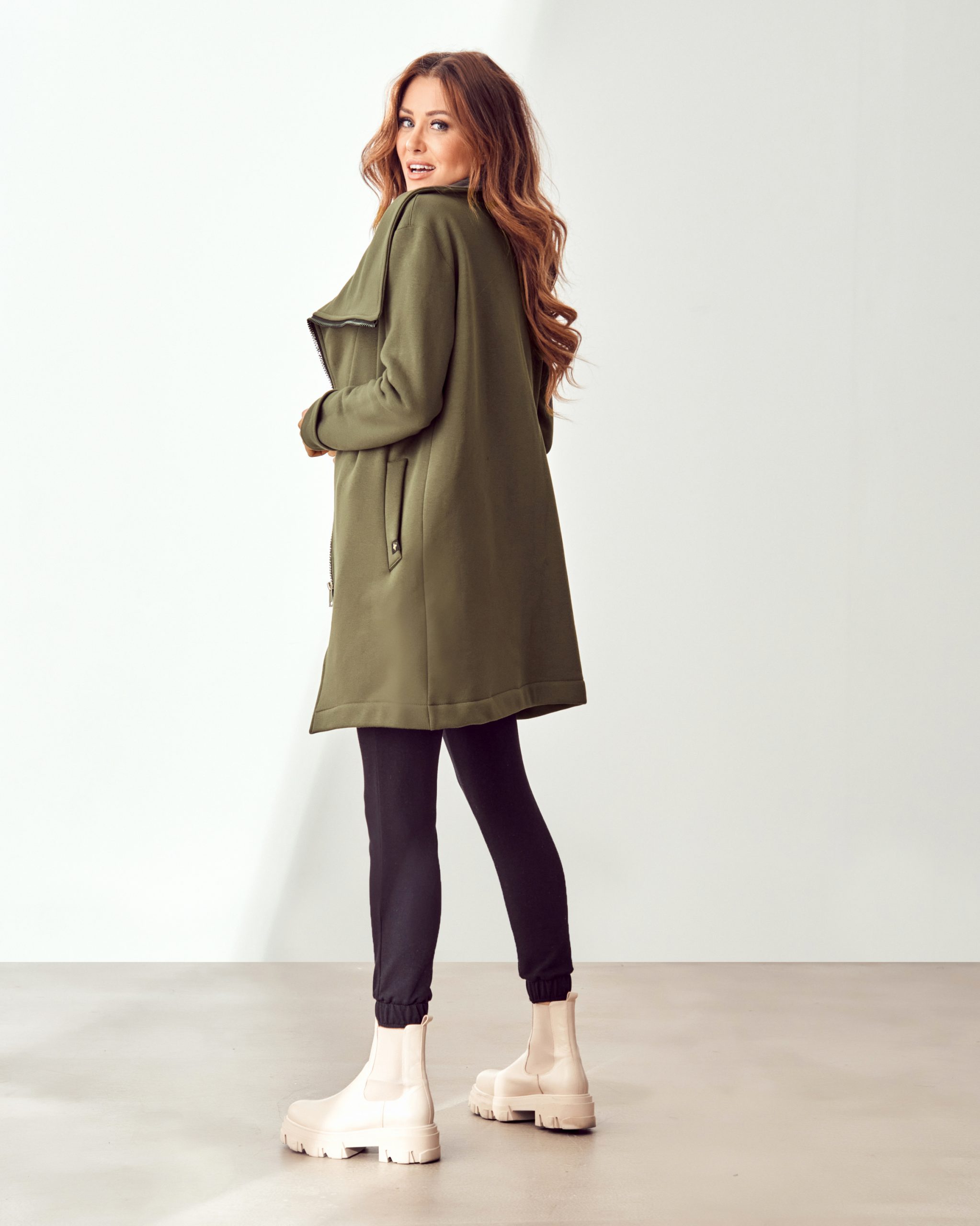Ekspres wszyty po skosie nadaje oryginalności. Płaszcz posiada ciekawy krój kołnierza, który można nosić na dwa sposoby.
