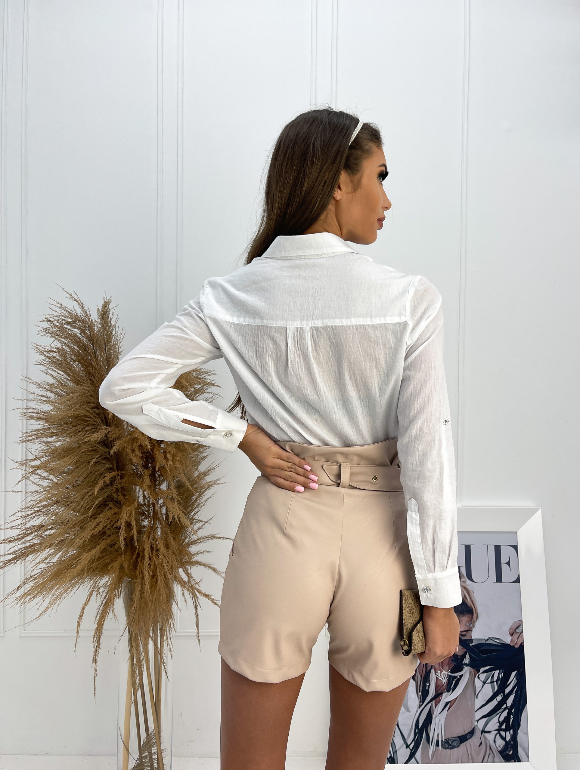 Spodenki Rita – Modny fason spodenek z EKO SKÓRY. Wysoki stan, asymetryczny krój i ozdobne napy nadają oryginalności. Charakterystyczny krój kieszeni i wysoki stan tuszują drobne niedoskonałości, a jednocześnie podkreślają kobiece kształty.