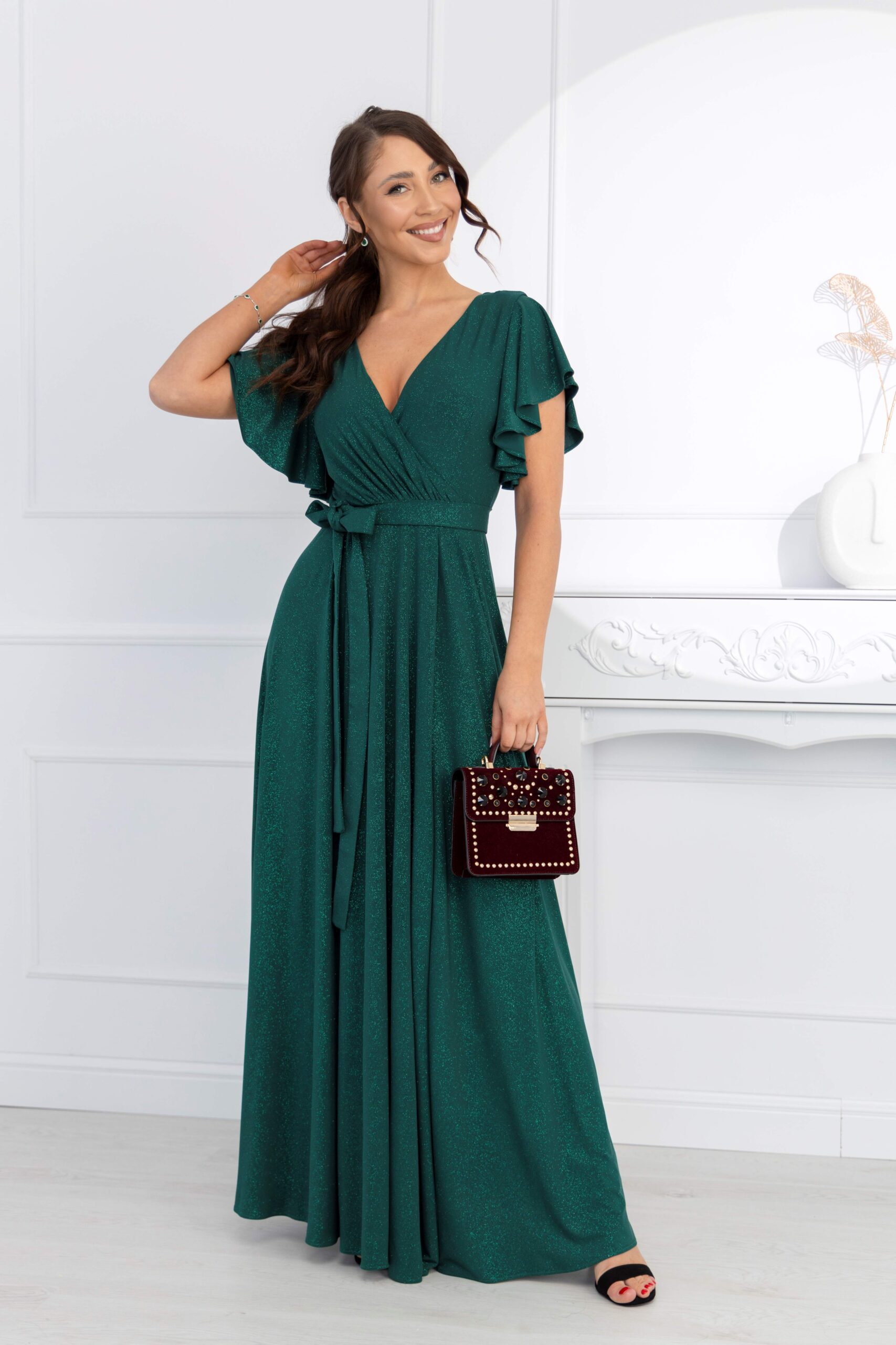 ALICE  z brokatem – to sukienka wieczorowa z luksusowej kolekcji PREMIUM!. To idealny przykład sukienki na wesele. Fantastycznie eksponuje kobiece wdzięki, jednocześnie tuszując drobne niedoskonałości. Wcięcie w talii i luźno puszczone biodra  wysmuklają sylwetkę, i sprawiają, że wygląda ona zgrabnie, zapewniając przy tym niezwykłą swobodę noszenia. Rozcięcie z przodu dodaje jej zwiewności i lekkości. Dużym atutem tej sukienki jest wysokiej jakości materiał z najmodniejszym w tym sezonie brokatem. W pasie znajduje się gumka, która zdecydowanie poprawia komfort noszenia.