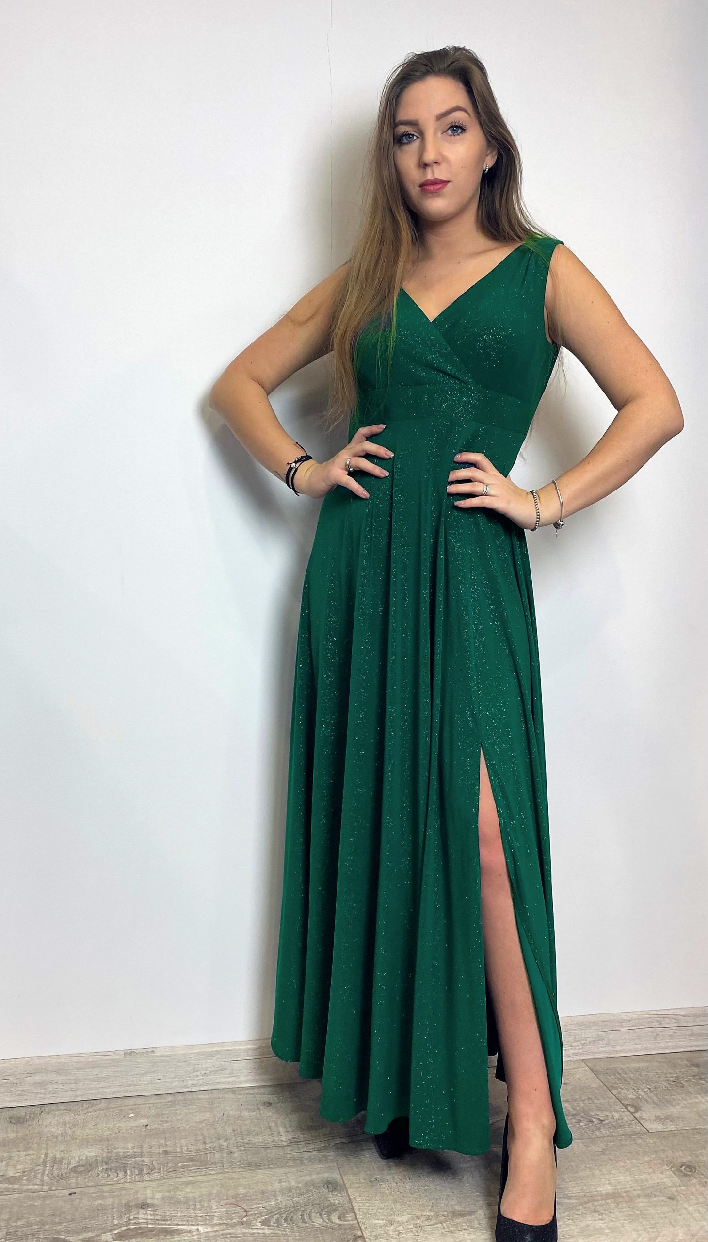 ANITA z brokatem – to sukienka wieczorowa o ciekawym i niepowtarzalnym kroju. To idealny przykład sukienki na wesele. Fantastycznie eksponuje kobiece wdzięki, jednocześnie tuszując drobne niedoskonałości. Wcięcie w talii i luźno puszczone biodra wysmuklają sylwetkę, i sprawiają, że wygląda ona zgrabnie, zapewniając przy tym niezwykłą wygodę noszenia. Rozcięcie z przodu dodaje jej zwiewności i lekkości. Dużym atutem tej sukienki jest materiał z najmodniejszym w tym sezonie brokatem! To zdecydowanie bardzo modna sukienka. Dzięki swej finezji i niepowtarzalności ANITA jest idealna jako sukienka na wesele. Świetnie się sprawdzi jako suknia wieczorowa, na mniejsze lub większe przyjęcia, bale karnawałowe, czy jako sukienka na studniówkę. Będziesz w niej wyglądać wytwornie i z pewnością olśnisz wszystkich wokół.