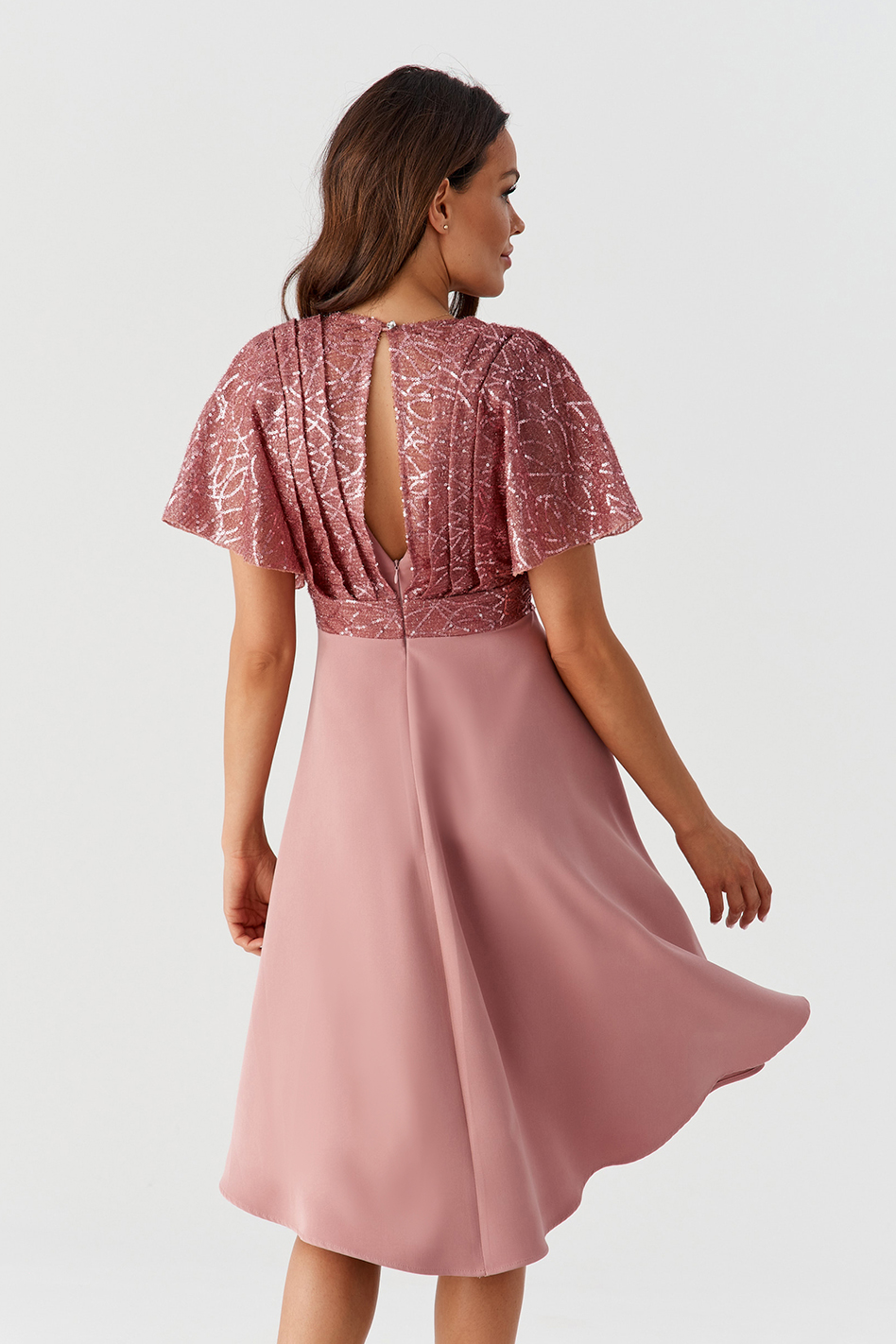 Połączenie połyskujących cekinów i gładkiego materiału sprawia, że jest to jednocześnie sukienka elegancka, jak również bardzo wytworna. Świetnie zaprojektowany dekolt sprawia, że biust prezentuje się niezwykle atrakcyjnie, natomiast wcięcie w talii i luźno puszczone biodra wysmuklają sylwetkę, i sprawiają, że wygląda ona bardzo zgrabnie. Swiecące cekiny dodają jej charakteru.
