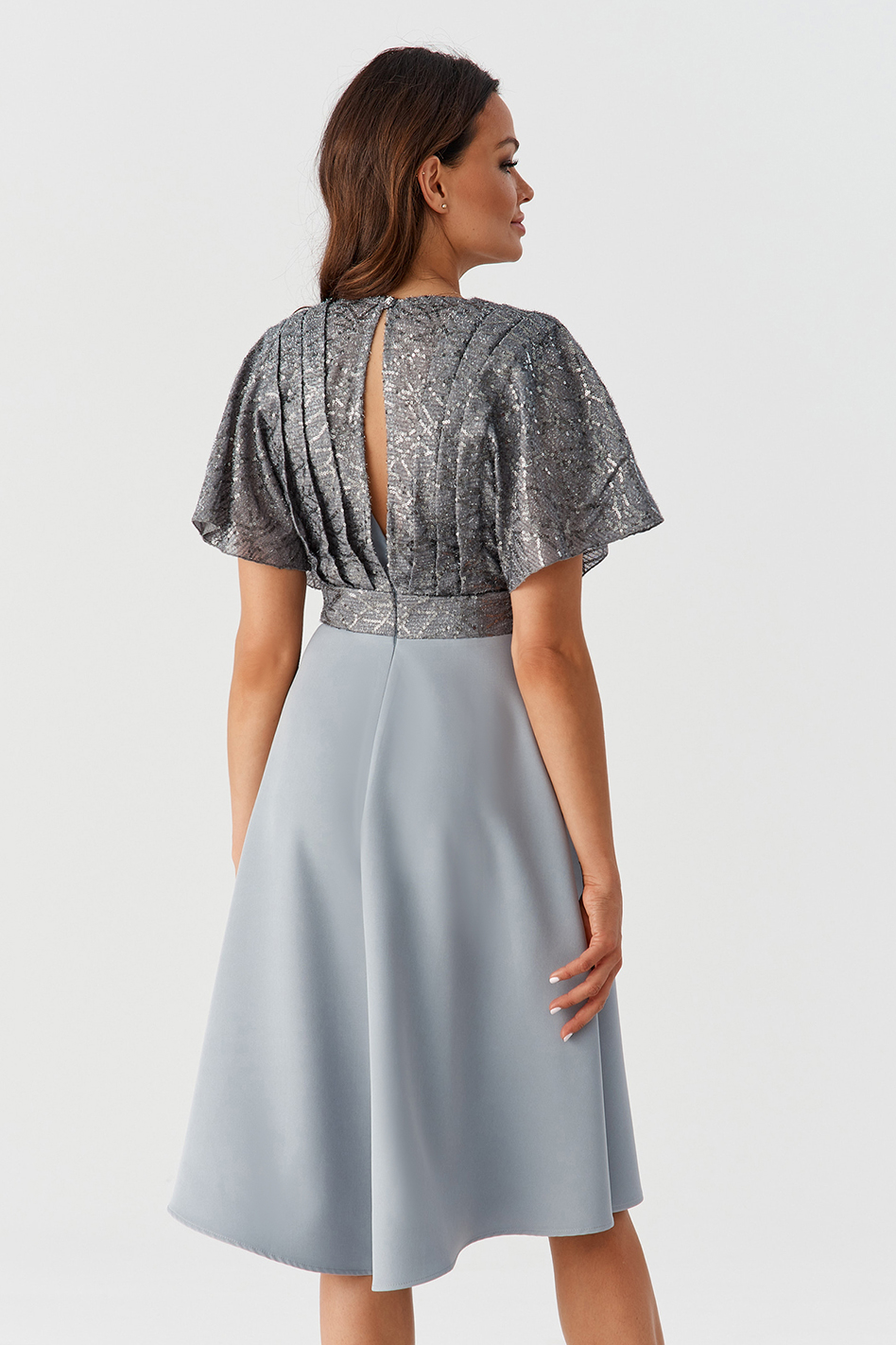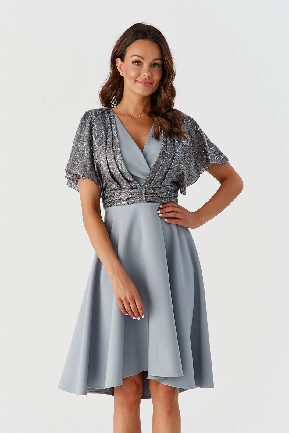 Połączenie połyskujących cekinów i gładkiego materiału sprawia, że jest to jednocześnie sukienka elegancka, jak również bardzo wytworna. Świetnie zaprojektowany dekolt sprawia, że biust prezentuje się niezwykle atrakcyjnie, natomiast wcięcie w talii i luźno puszczone biodra wysmuklają sylwetkę, i sprawiają, że wygląda ona bardzo zgrabnie. Swiecące cekiny dodają jej charakteru.