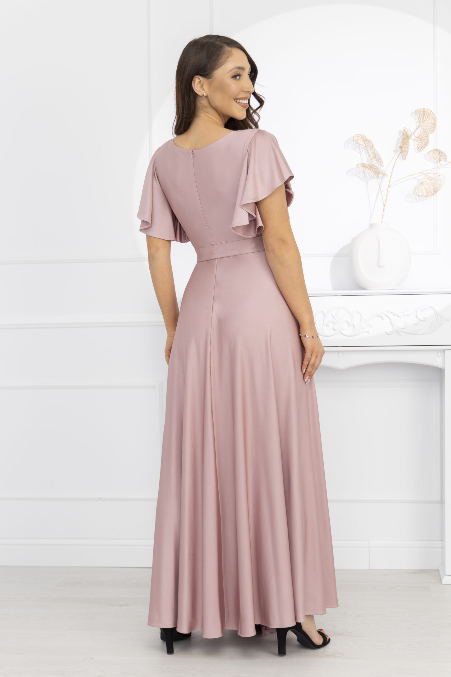 INES – to sukienka wieczorowa z luksusowej kolekcji PREMIUM!. To idealny przykład sukienki na wesele. Fantastycznie eksponuje kobiece wdzięki, jednocześnie tuszując drobne niedoskonałości. Wcięcie w talii i luźno puszczone biodra wysmuklają sylwetkę, i sprawiają, że wygląda ona zgrabnie, zapewniając przy tym niezwykłą swobodę noszenia. Rozcięcie z przodu dodaje jej zwiewności i lekkości. Dużym atutem tej sukienki jest wysokiej jakości, POŁYSKUJĄCY materiał, który się uciąga. W pasie znajduje się gumka, która zdecydowanie poprawia komfort noszenia.