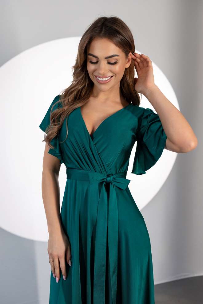 INES – to sukienka wieczorowa z luksusowej kolekcji PREMIUM!. To idealny przykład sukienki na wesele. Fantastycznie eksponuje kobiece wdzięki, jednocześnie tuszując drobne niedoskonałości. Wcięcie w talii i luźno puszczone biodra wysmuklają sylwetkę, i sprawiają, że wygląda ona zgrabnie, zapewniając przy tym niezwykłą swobodę noszenia. Rozcięcie z przodu dodaje jej zwiewności i lekkości. Dużym atutem tej sukienki jest wysokiej jakości, POŁYSKUJĄCY materiał, który się uciąga. W pasie znajduje się gumka, która zdecydowanie poprawia komfort noszenia.