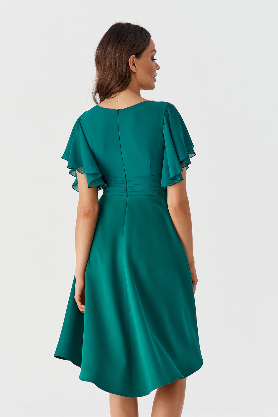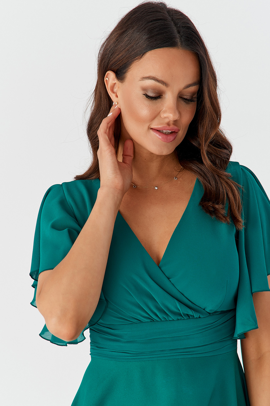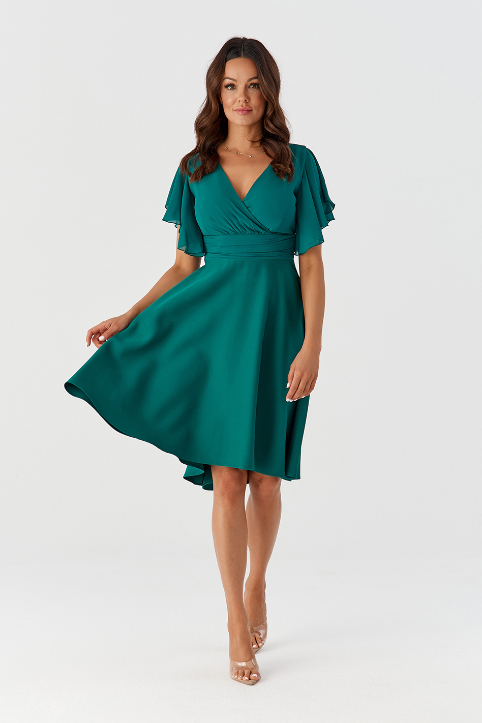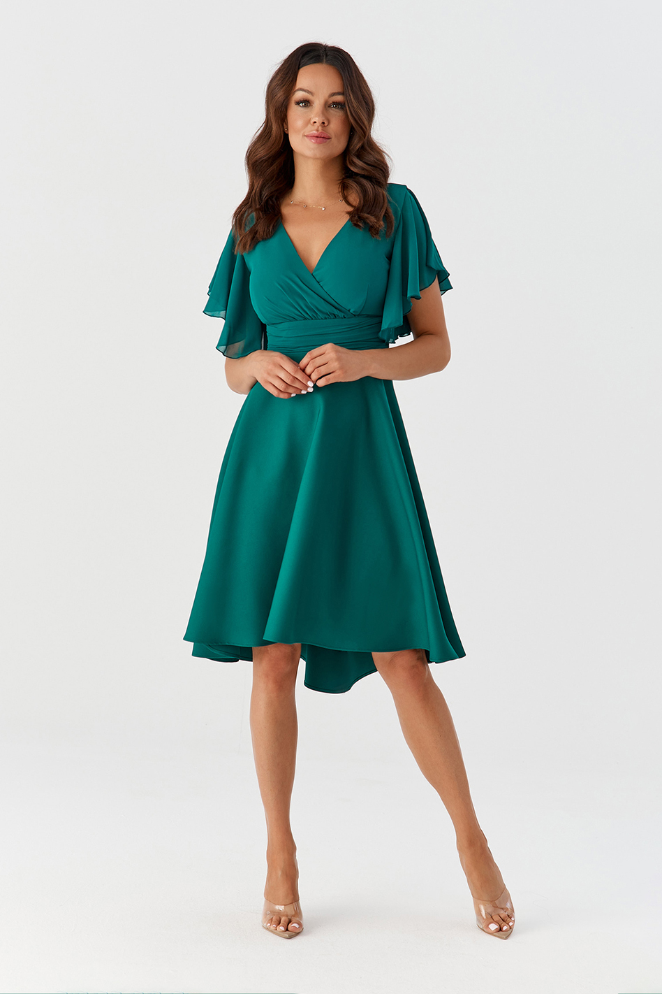 Połączenie zwiewnego szyfonu i gładkiego materiału sprawia, że jest jednocześnie sukienka elegancka, jak również bardzo delikatna. Świetnie zaprojektowany dekolt sprawia, że biust prezentuje się niezwykle atrakcyjnie, natomiast wcięcie w talii i luźno puszczone biodra wysmuklają sylwetkę, i sprawiają, że wygląda ona bardzo zgrabnie. Delikatne i zwiewne rękawki  nadają jej lekkości.