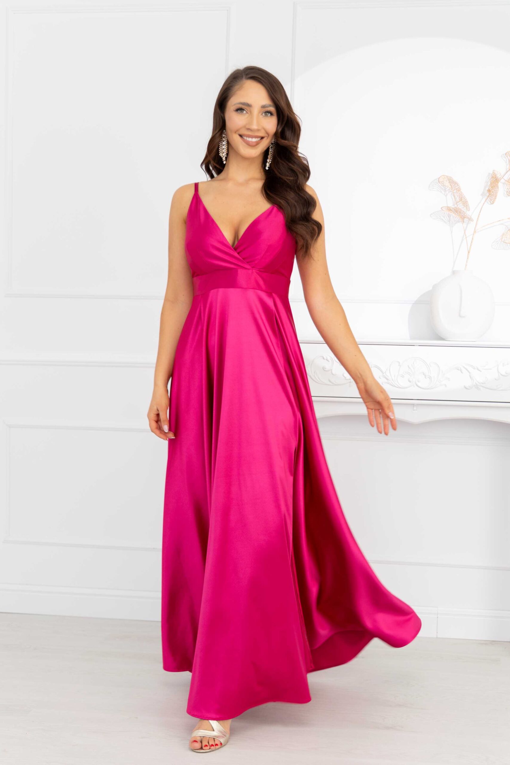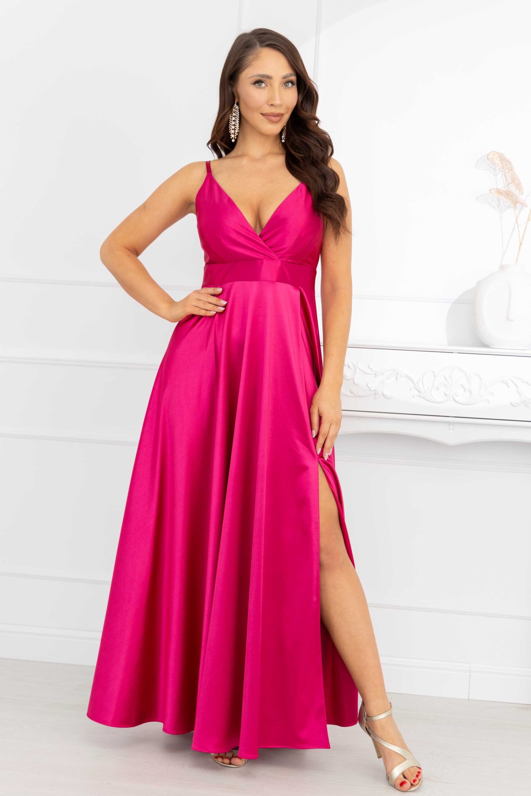 To idealny przykład sukienki na wesele. Fantastycznie eksponuje kobiece wdzięki, jednocześnie tuszując drobne niedoskonałości. Wcięcie pod biustem i luźno puszczone biodra wysmuklają sylwetkę, i sprawiają, że wygląda ona zgrabnie, zapewniając przy tym niezwykłą wygodę noszenia. Rozcięcie na nodze oraz cienkie, regulowane ramiączka dodają jej zwiewności i lekkości.