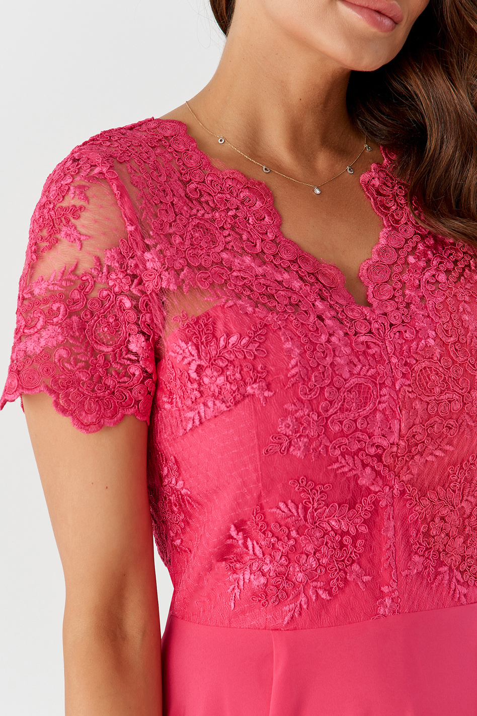 Zestawienie ponadczasowej koronki z delikatną tkaniną to niezapomniany look dla pań w różnym wieku. Dopasowana góra, i luźno puszczone biodra tworzą bardzo atrakcyjną całość. Zmysłowe rozcięcie na nodze nadaje jej  lekkości i zwiewności, zapewniając przy tym niezwykłą swobodę noszenia.