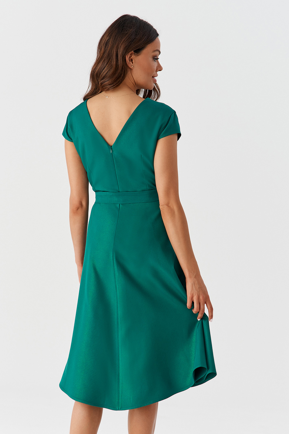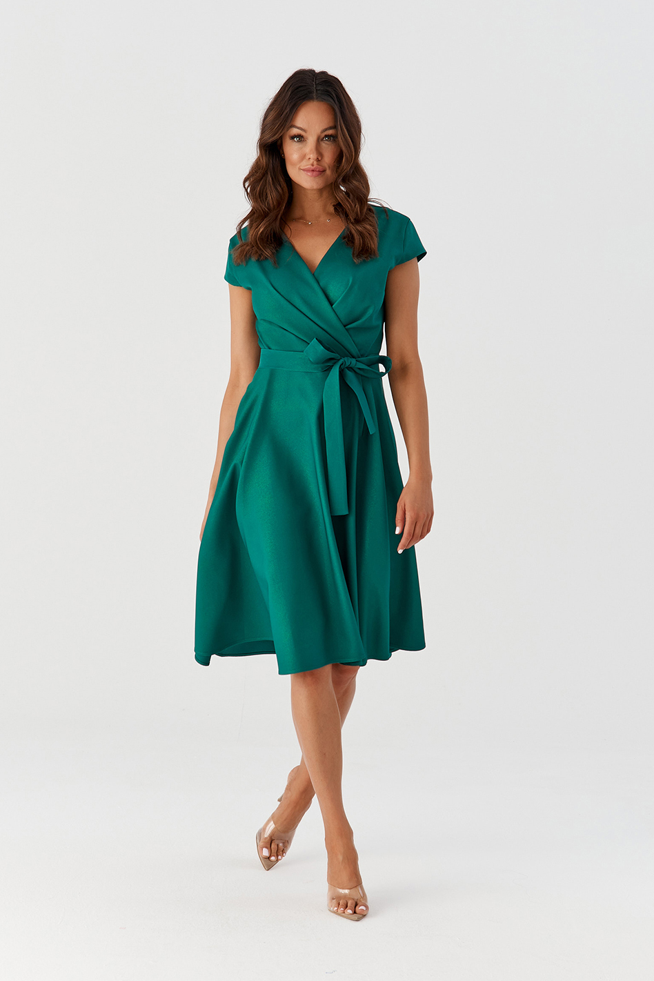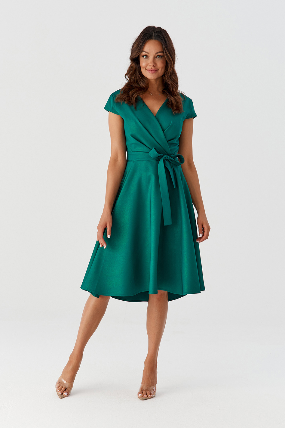 Wspaniale podkreśla kobiece atuty. Świetnie zaprojektowany dekolt sprawia, że biust prezentuje się niezwykle atrakcyjnie, natomiast wcięcie w talii i luźno puszczone biodra wysmuklają sylwetkę, i sprawiają, że wygląda ona bardzo zgrabnie. Pasek przewiązany w pasie dopełnia całości i nadaje jej lekkości. Połyskujący materiał dodaje blasku, dzięki któremu sukienka ma niepowtarzalny charakter.