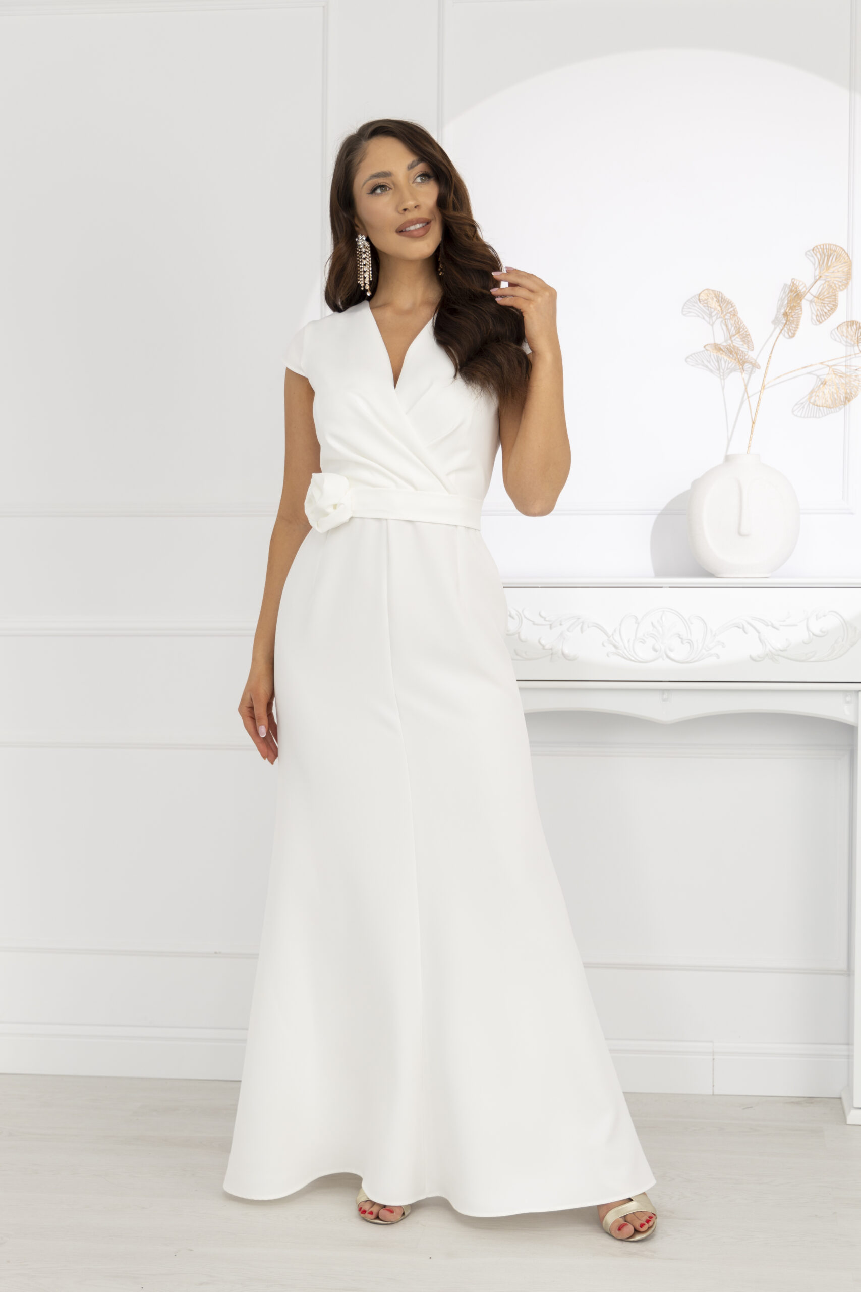 Nasza Róża ecru, to harmonijne połączenie klasyki i stylu, tworzące niezapomniany look dla każdej przyszłej panny młodej. Niezwykle elegancka, długa sukienka, idealnie się sprawdzi jako sukienka na poprawiny.