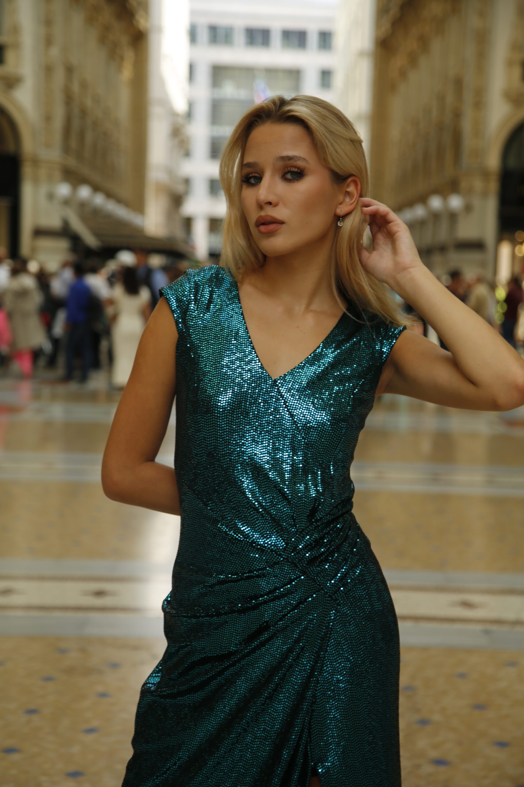TIFFANY to wyjątkowa suknia z serii PREMIUM kreacji wieczorowych. Niesamowicie zmysłowa, jednocześnie luksusowa sukienka. Lśniący i uciągliwy wysokiej jakości materiał pokryty delikatnymi cekinami fantastycznie podkreśla kobiece piękno, zapewniając przy tym niezwykłą swobodę noszenia. Idealna sukienka na wesele, wszelkiego rodzaju eventy, bale sylwestrowe, a także jako wymarzona sukienka na studniówkę.